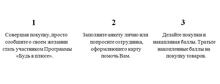 Программа лояльности "Будь в плюсе" позволяет совершать покупки в отделах нашего магазина с выгодой для держателей карт.